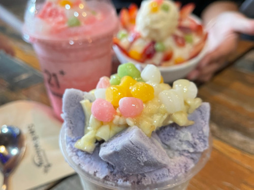 韓国の人気デザートであるパッピンスは、細かく刻んだフルーツ、コンデンスミルク、フルーツシロップ、小豆などの甘いトッピングを加えた上質なかき氷で仕上げられています。
